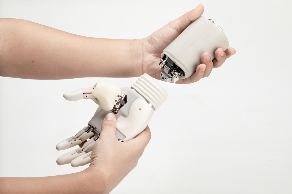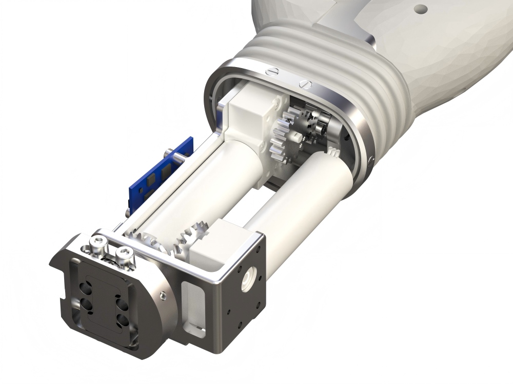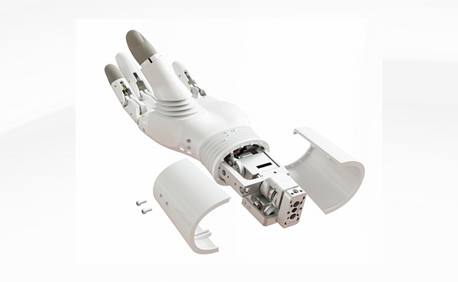 对产品结构件中的6061铝材进行整体镂空设计及阳极处理,在实现产品轻量化的同时强化材料抗腐蚀性能,同时对基于满足力学结构需要使用的高性能钢进行热处理,加强产品结构强度;各组件的重心点以靠近近心端位置为设计原则,电机重心点靠近接受腔,其中手部质量不超过300克,通过利用关节的杠杆原理来减轻手臂承重负担,带来更轻松舒适的佩戴体验。